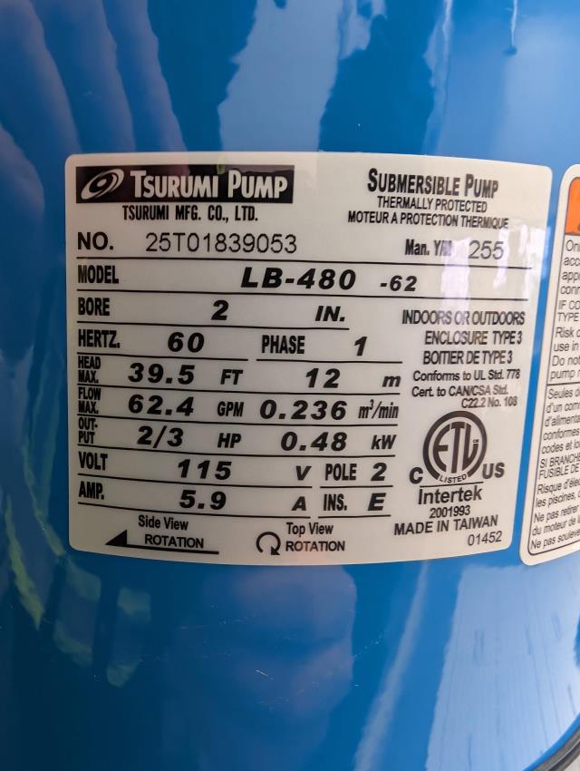 - MODEL: LB-480 2", HEAD MAX 39.5 FT, 62.4 GPM, 115V, 5.9 AMPS